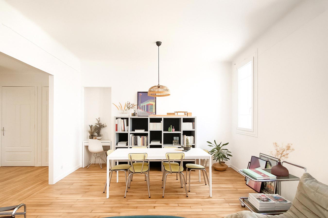 Niché au dernier étage d’un immeuble caractéristique de la reconstruction de Reims, au cœur du quartier Boulingrin, cet appartement a été rénové à moindre frais pour sublimer la lumière naturelle, les espaces traversants, les matières anciennes. Choix est fait de la fonctionnalité pour la cuisine qui méritait bien un renouveau d’usage !