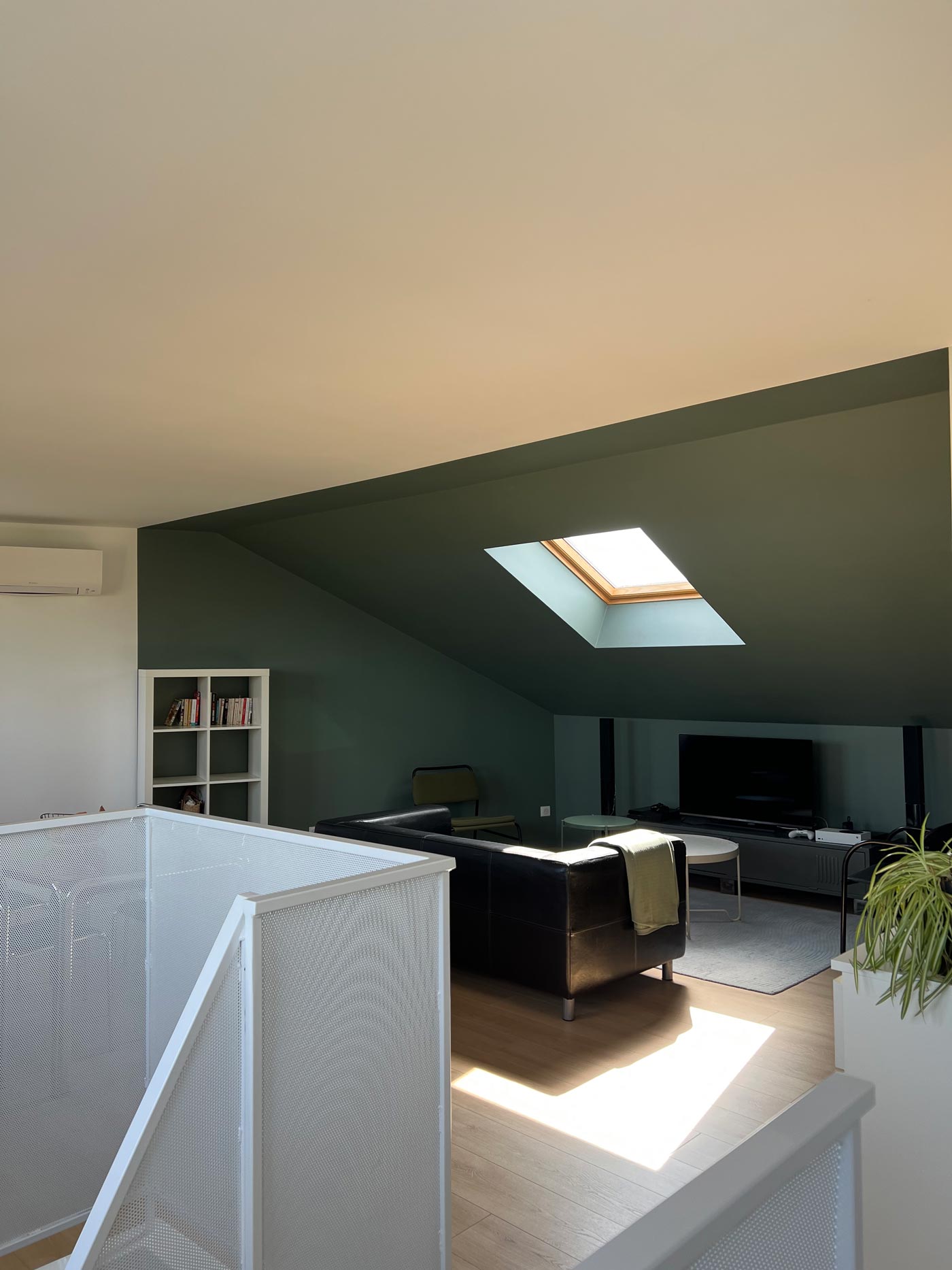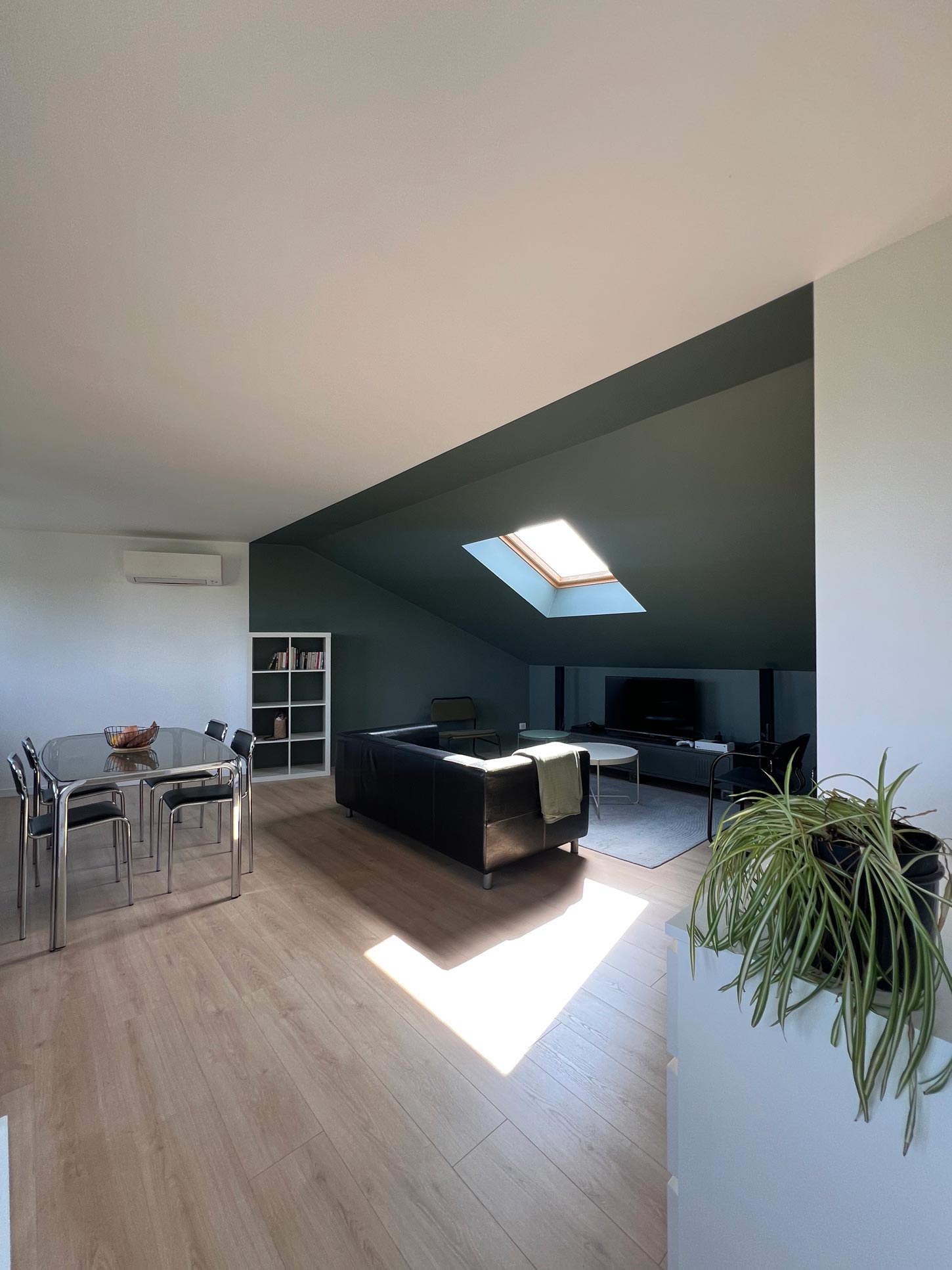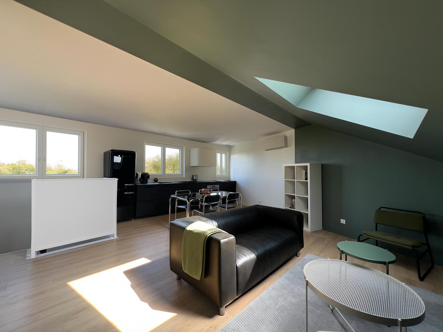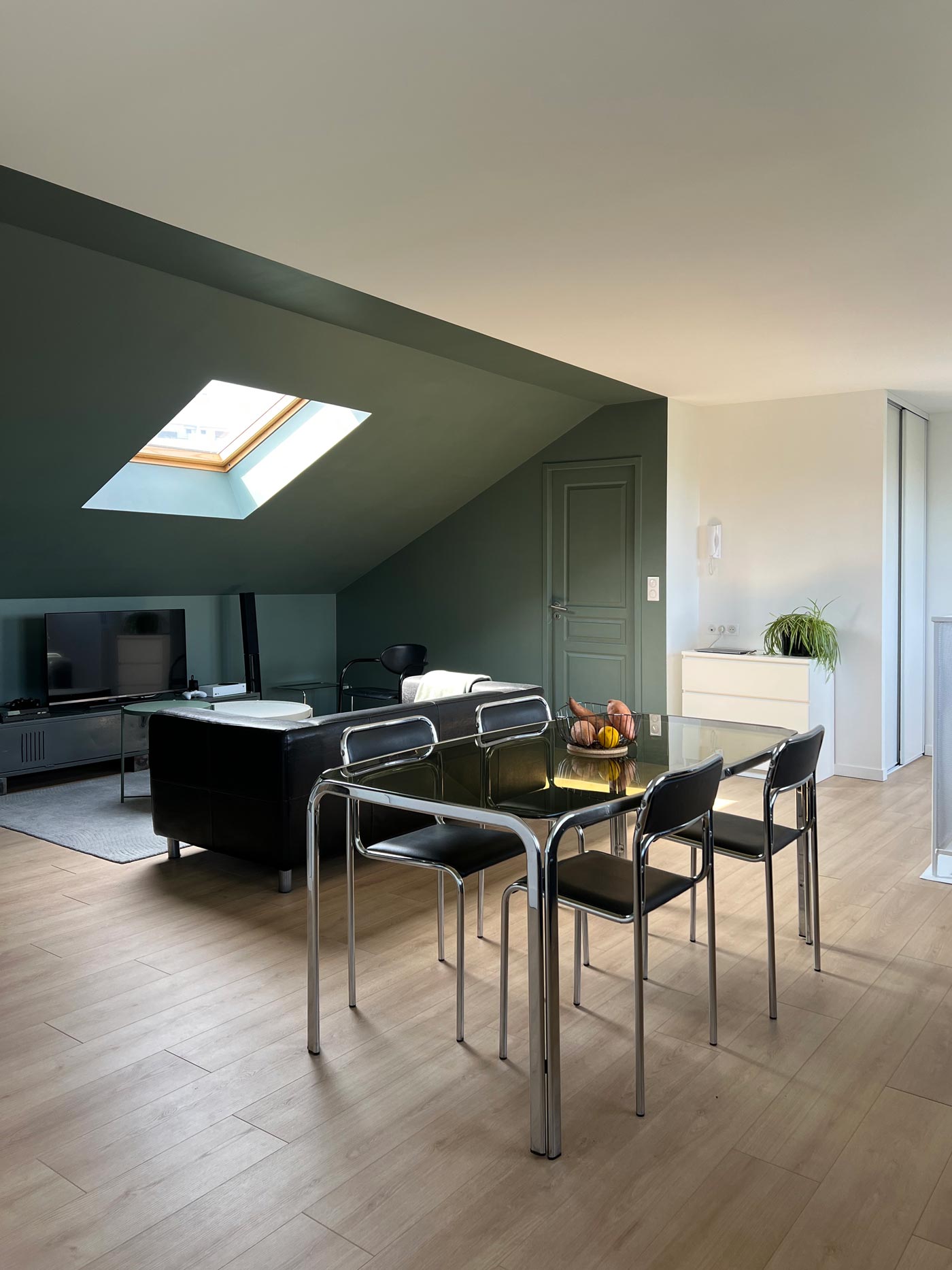 Au-dessus d’un immeuble, une surélévation récente accueille un appartement T2, imaginé comme un lieu de vie contemporain et lumineux. Il privilégie des espaces traversants, en adéquation avec les modes d’usage actuels : les espaces de vie sont ouverts, mais identifiés par des ambiances distinctes, où la course du soleil joue avec les usages.
