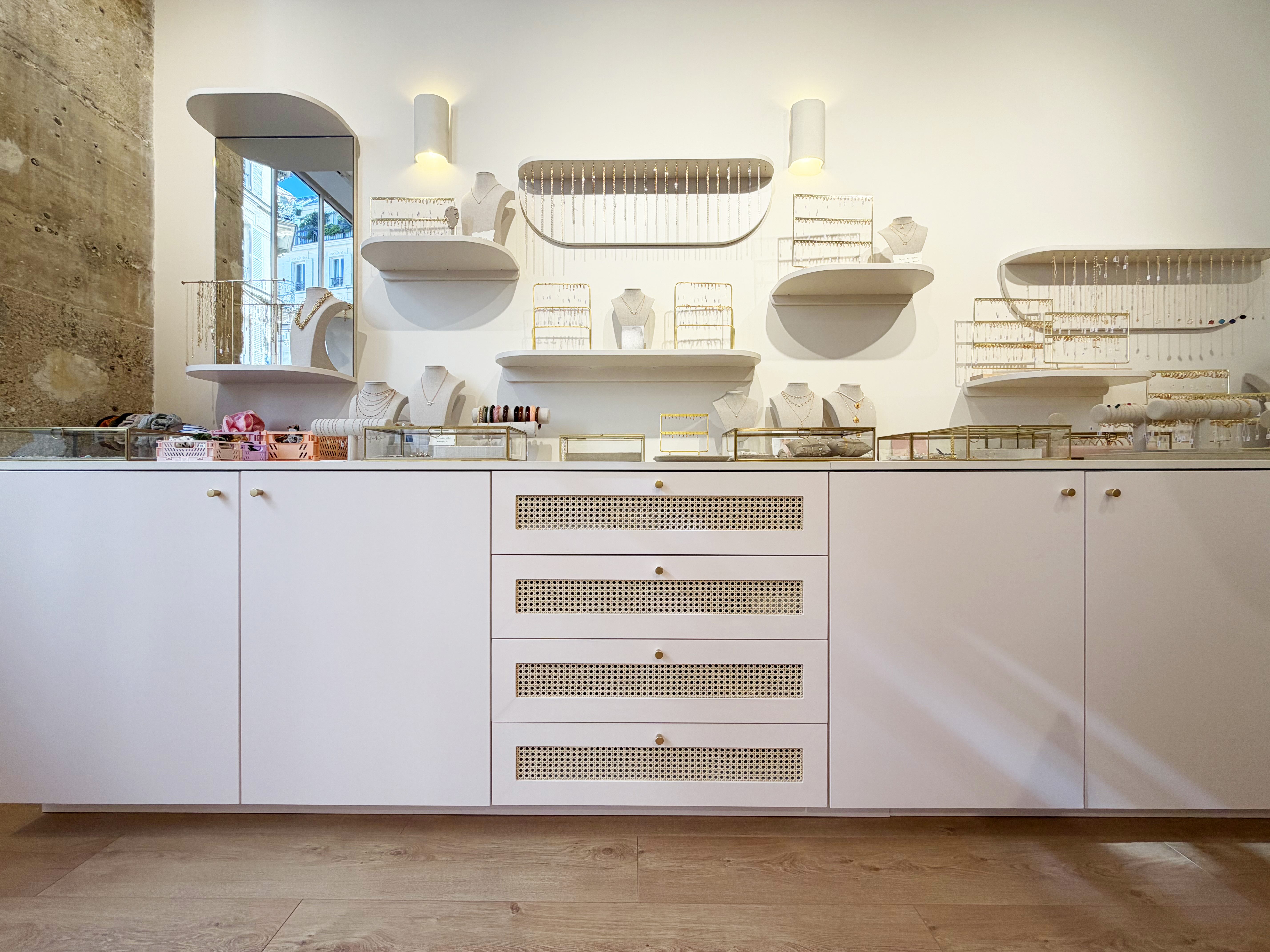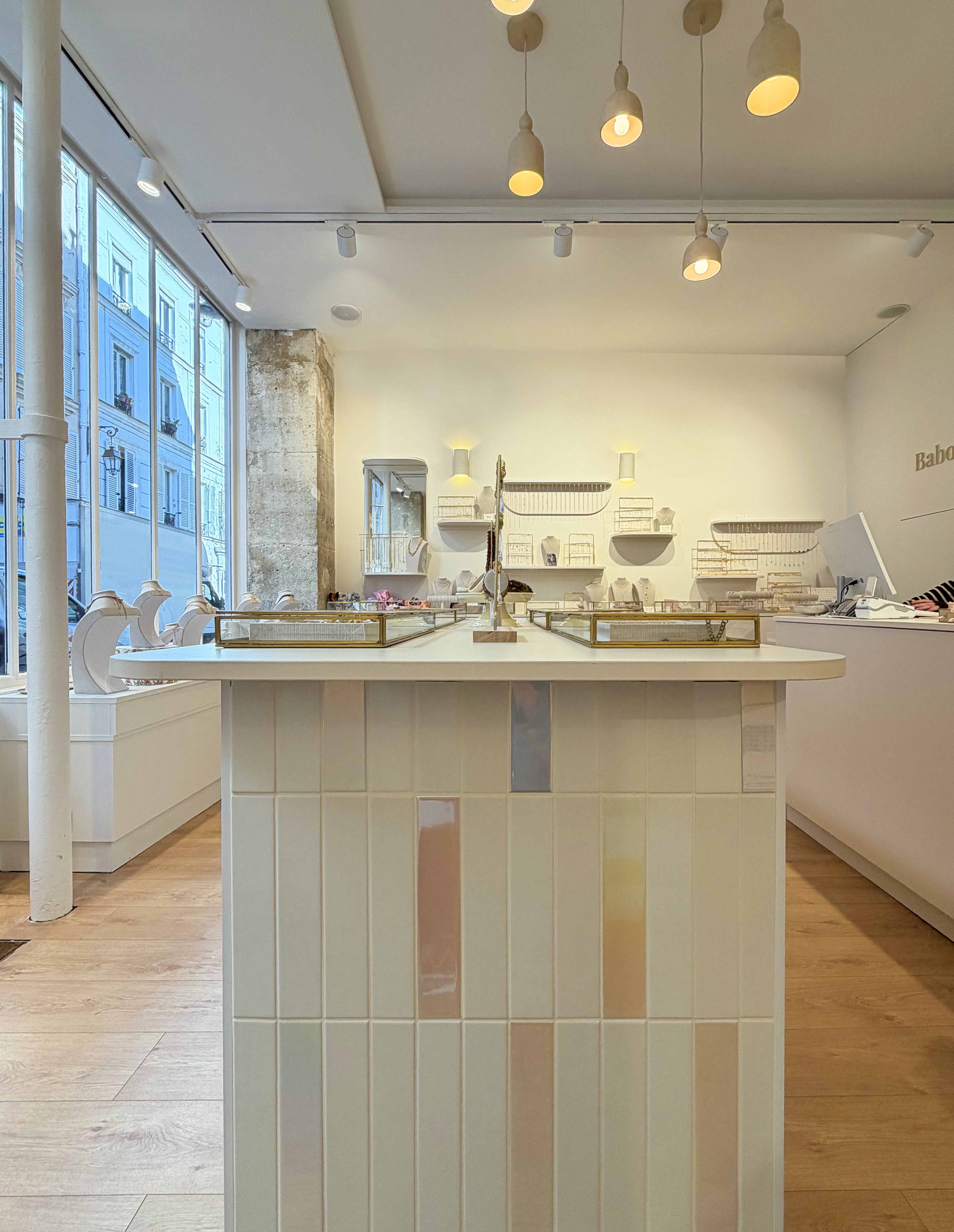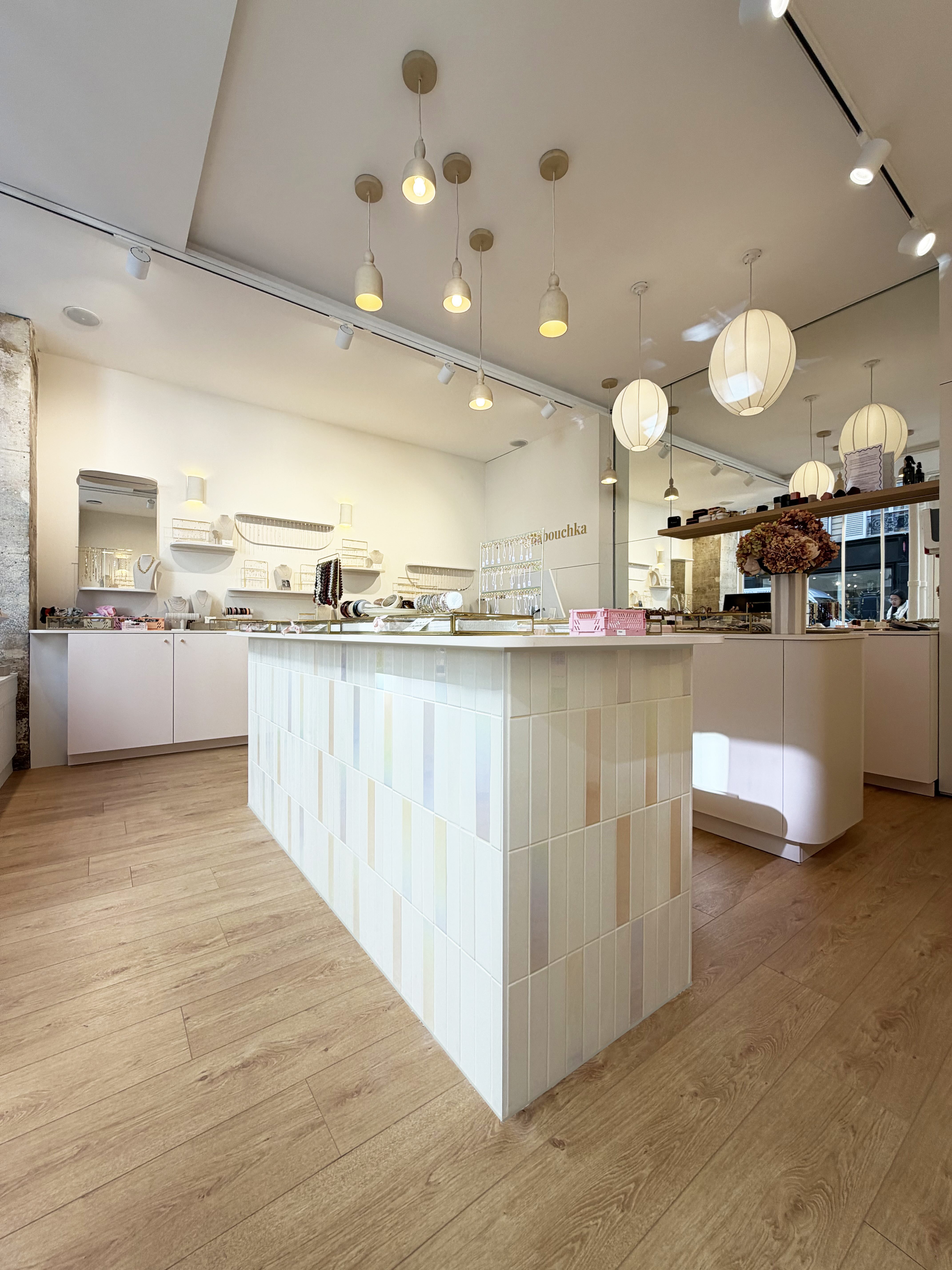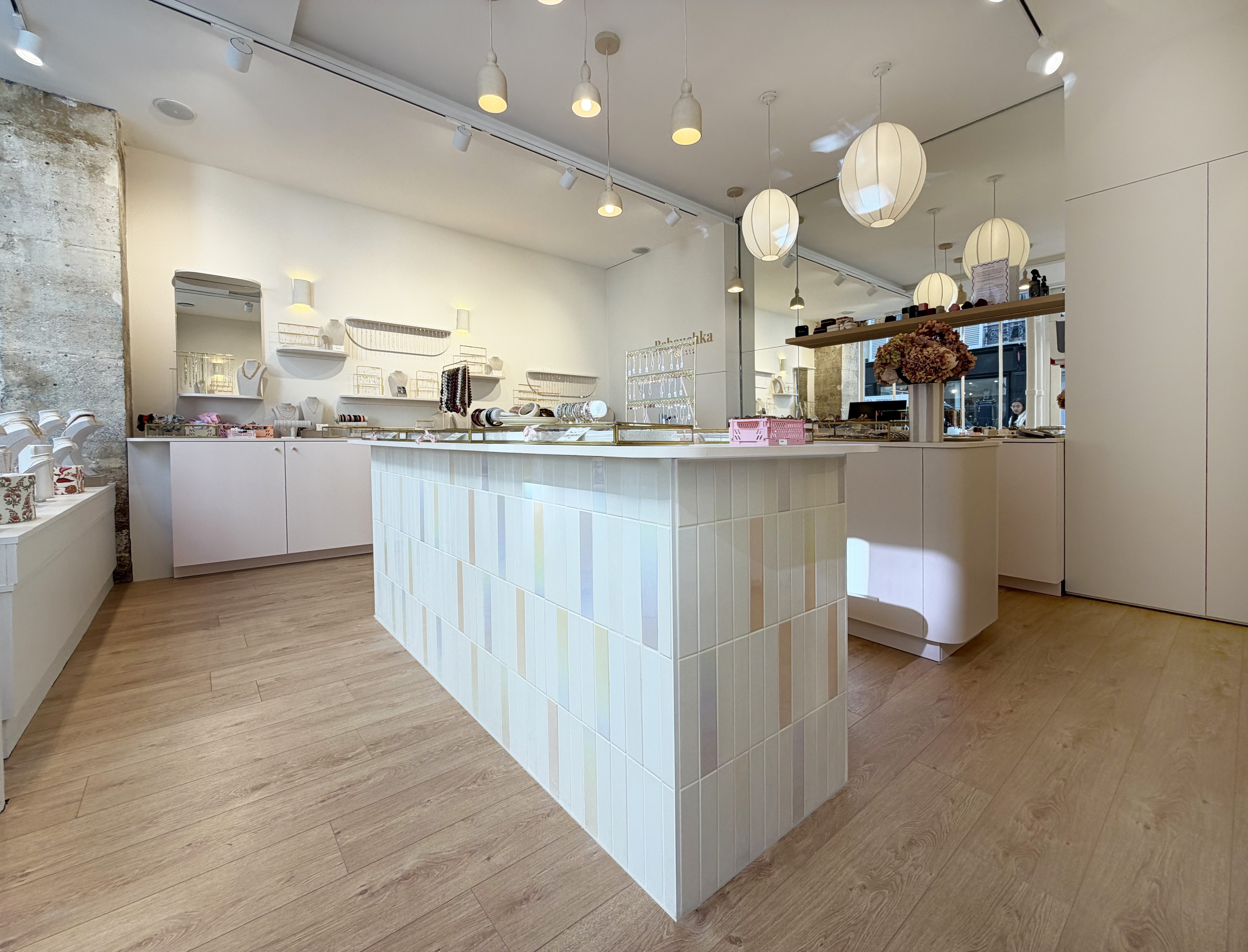 Nous avons travaillé avec des matériaux colorés aux tonalités douces qui apportent de la personnalité sans rompre avec la délicatesse de l’univers Babouchka. Des éléments graphiques ponctuent l’espace, tandis qu’un travail sur la lumière et les reflets multiplie les perspectives et met en valeur les pièces exposées.