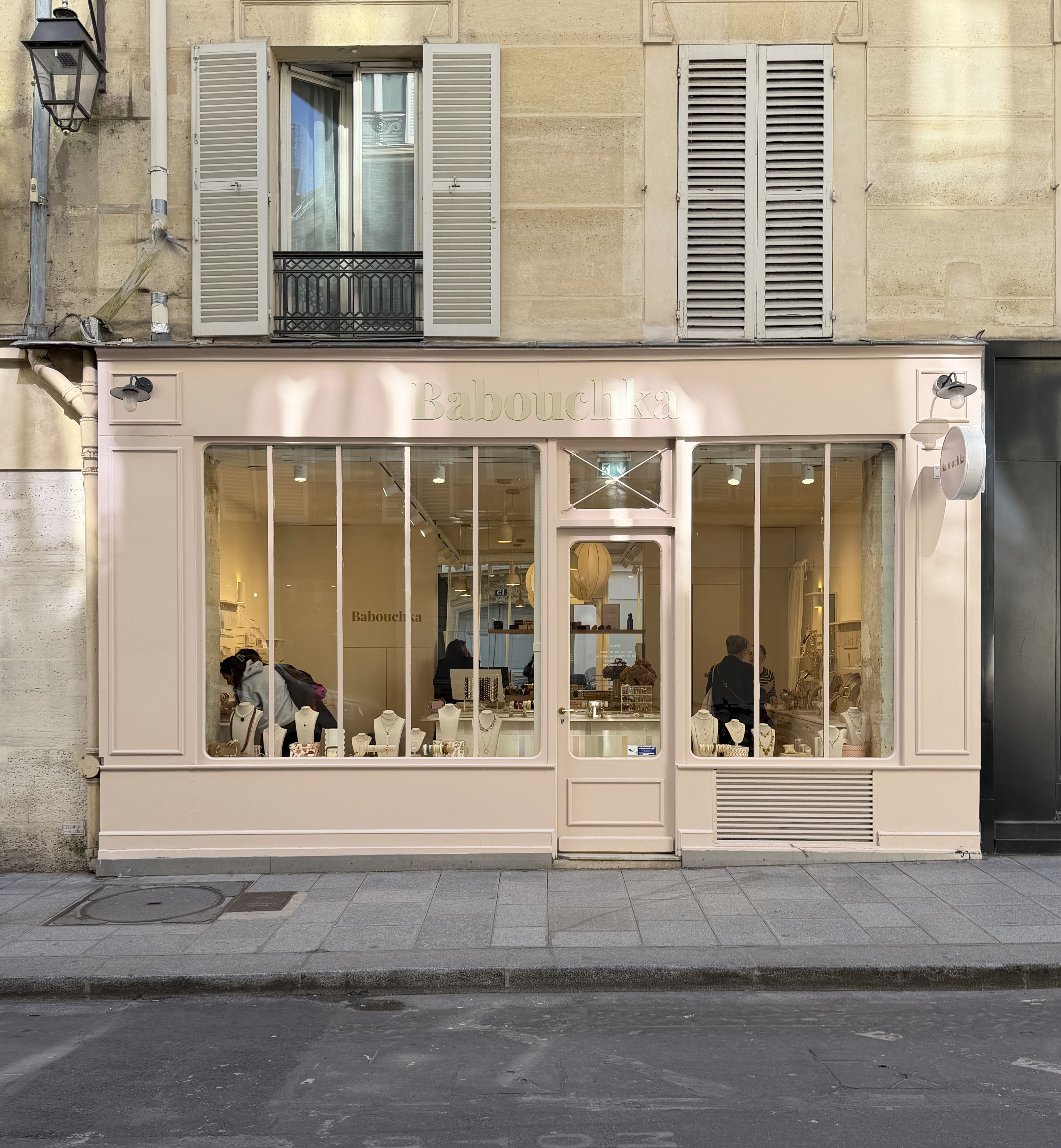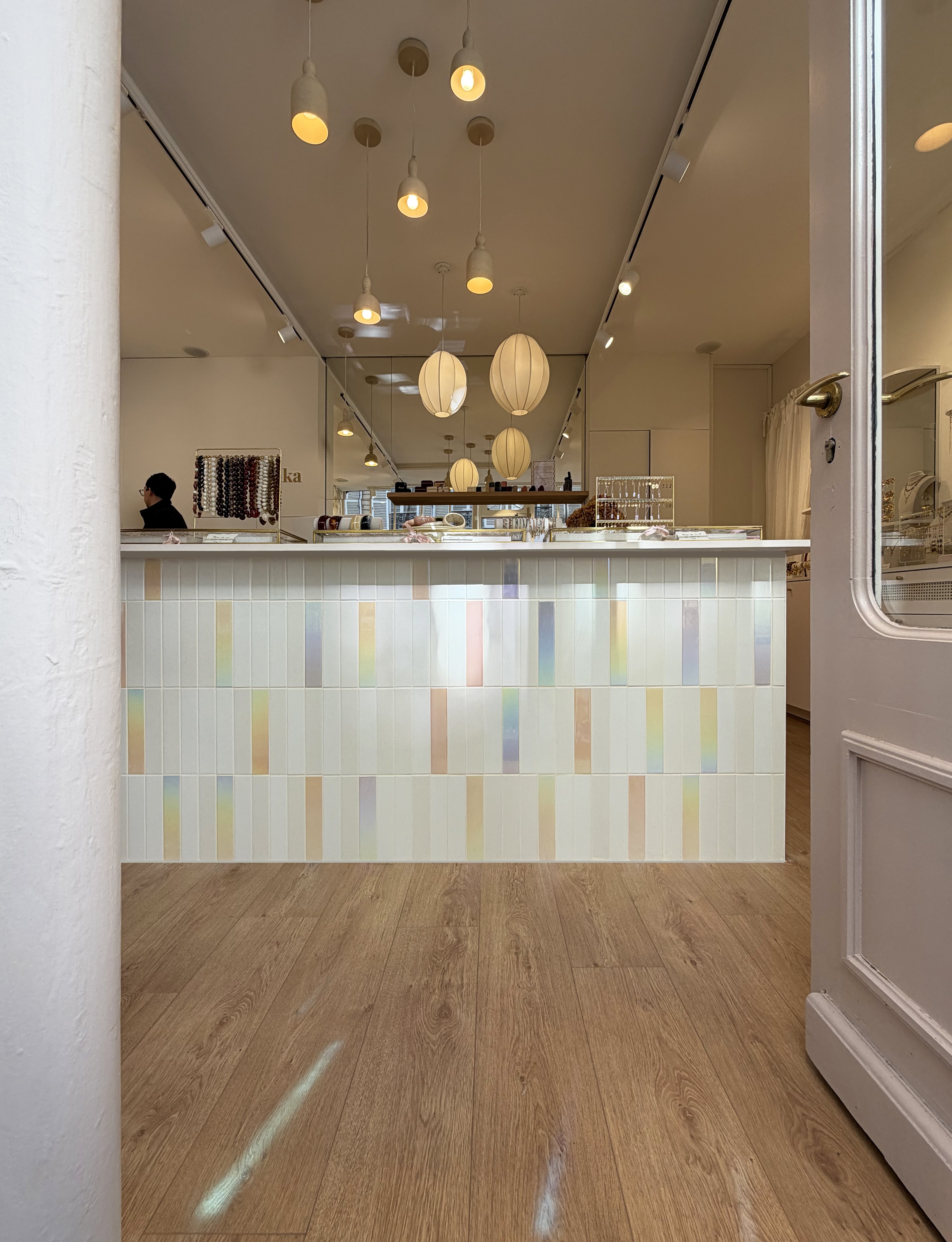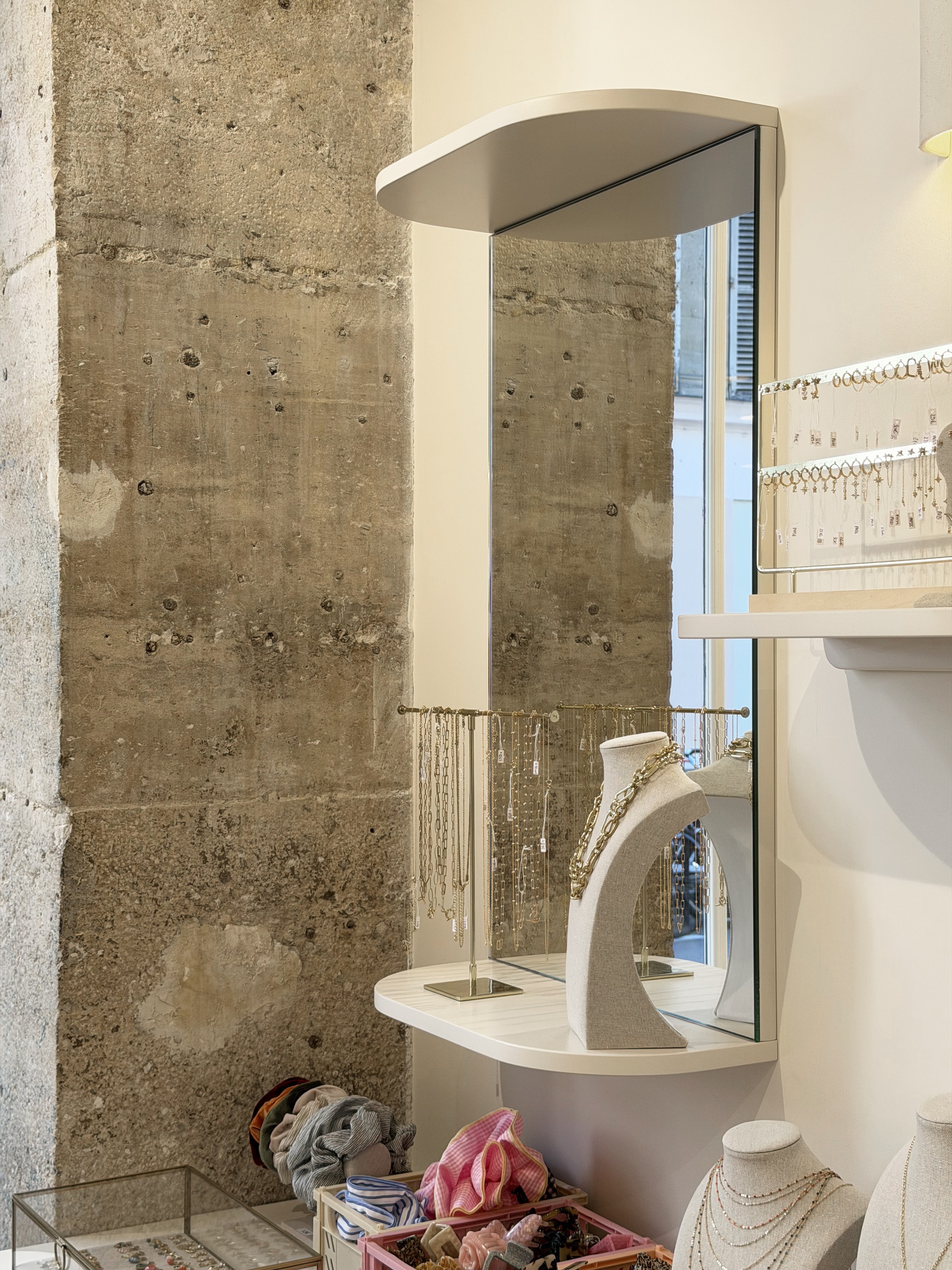 Nous avons travaillé avec des matériaux colorés aux tonalités douces qui apportent de la personnalité sans rompre avec la délicatesse de l’univers Babouchka. Des éléments graphiques ponctuent l’espace, tandis qu’un travail sur la lumière et les reflets multiplie les perspectives et met en valeur les pièces exposées.