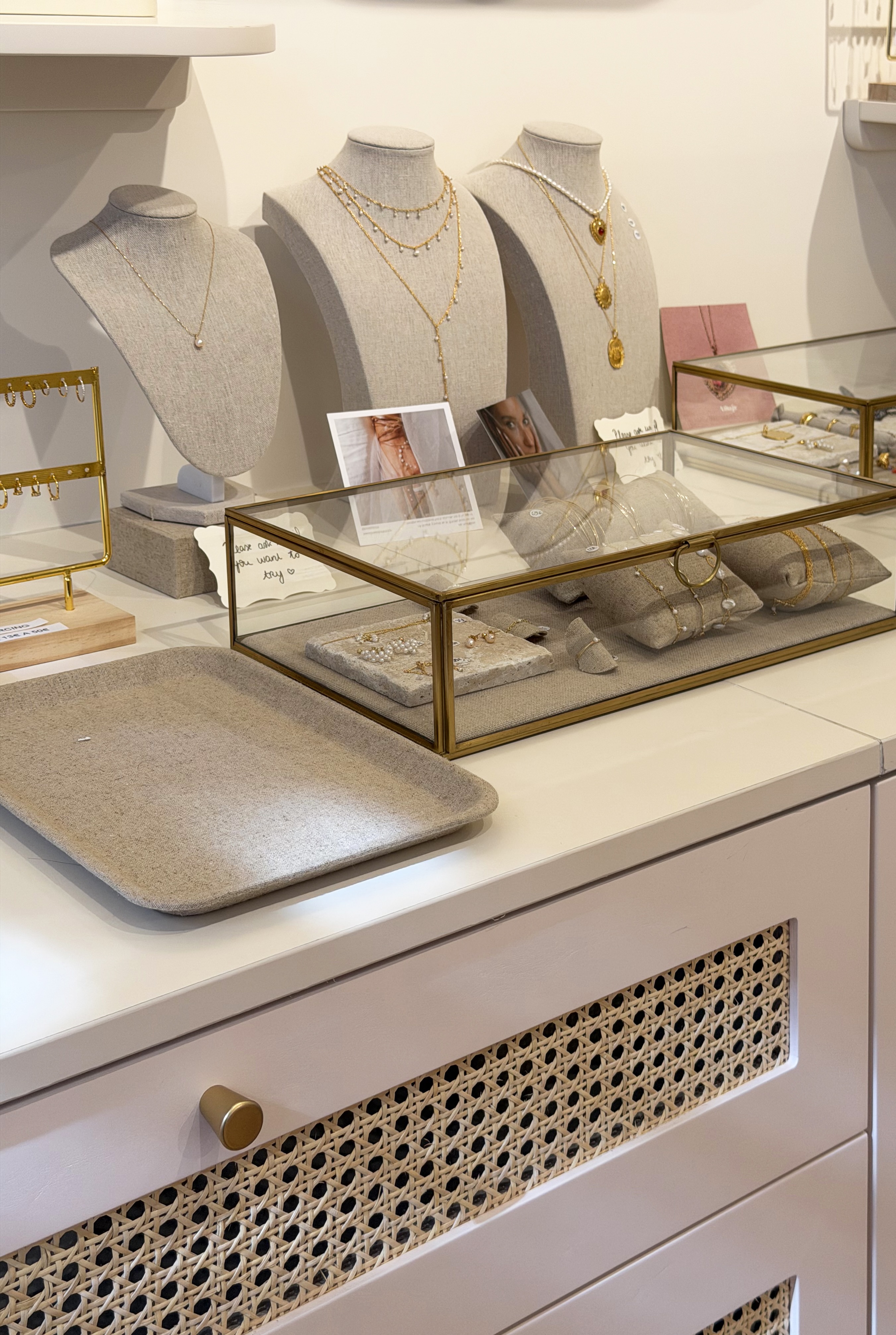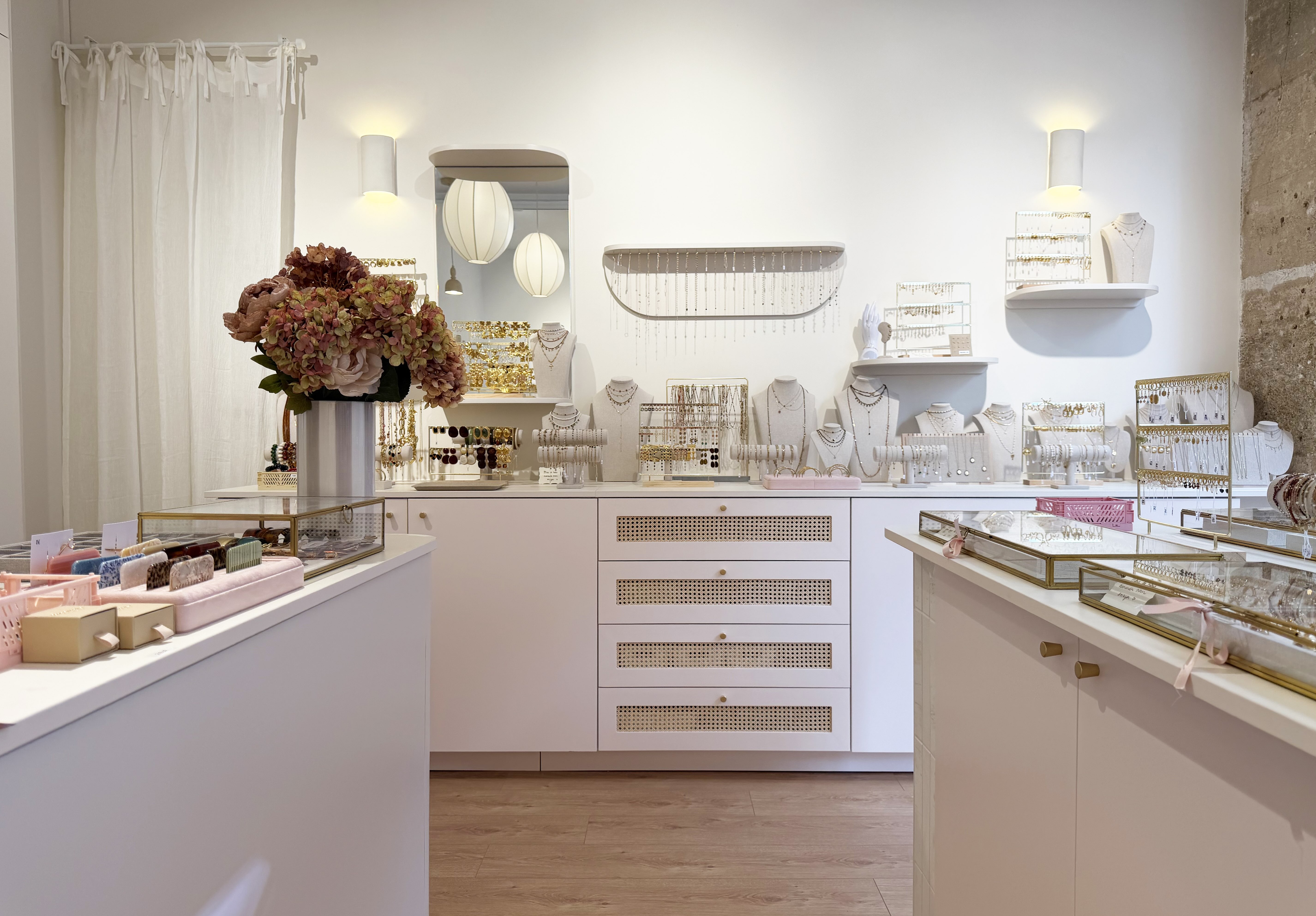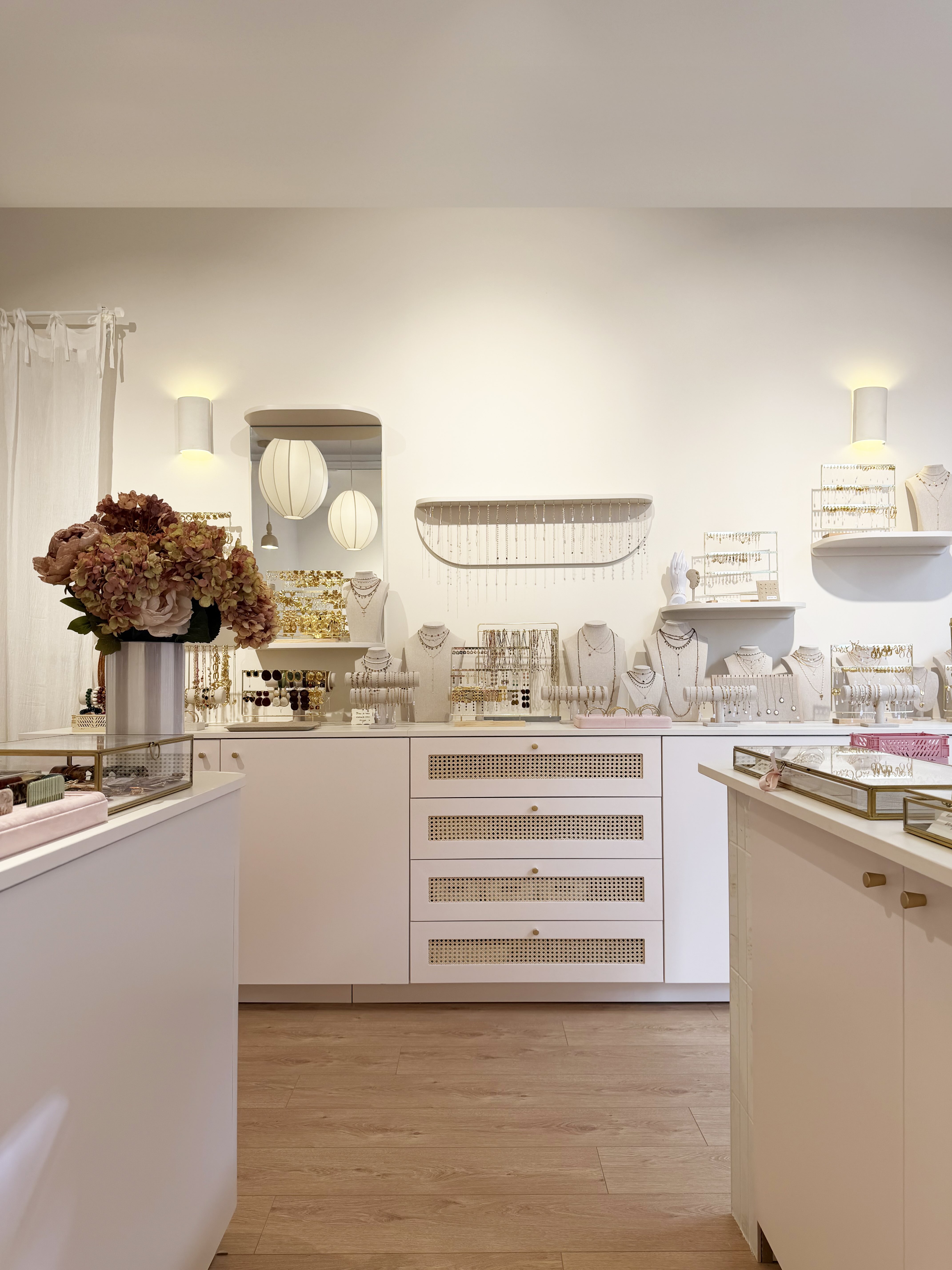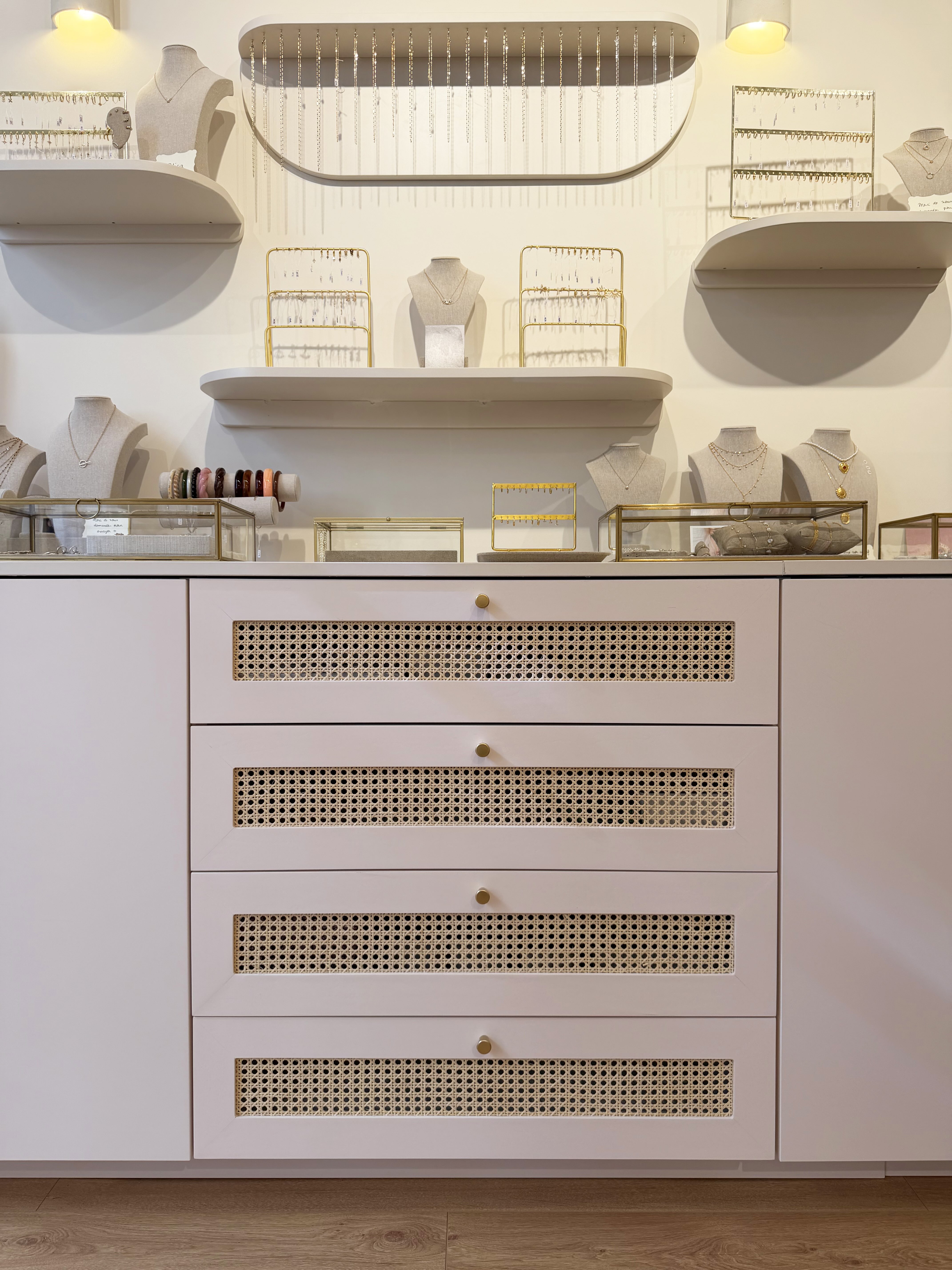 Nous avons travaillé avec des matériaux colorés aux tonalités douces qui apportent de la personnalité sans rompre avec la délicatesse de l’univers Babouchka. Des éléments graphiques ponctuent l’espace, tandis qu’un travail sur la lumière et les reflets multiplie les perspectives et met en valeur les pièces exposées.